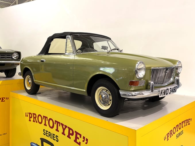 The prototype on display was constructed using two Mini sub-frames and fitted with a Mini Cooper S engine. The chassis was then sent out to Italy, where Pininfarina designed and built the body.