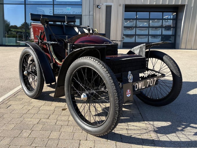 Herbert Austin's third Wolseley design and his first four-wheeler, forming the basis of production models that Wolseley introduced in 1901. It has a front-mounted engine with a single horizontal cylinder and a belt drive to a central gearbox and chain drive to the rear wheels. Steering is by a tiller.